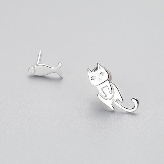 • Fashion Asymmetry 925 Sterling Silver Stud Earrings Animal Fish Cat Stud Earrings for Women Personality Jewelry Gifts
